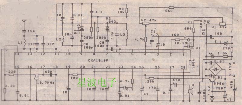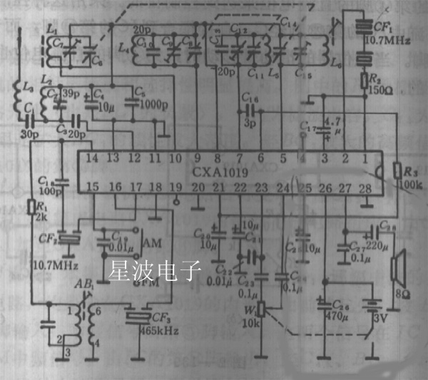 CXA1019 IC是日本索尼公司的产品,其外形有大直插、小直插和贴片三种。本集成块包括了调幅和调频的全部电路,具有外围元件少,适应电压范围广,耗电省,灵敏度高,失真小等优点,多年来一直被广泛应用。