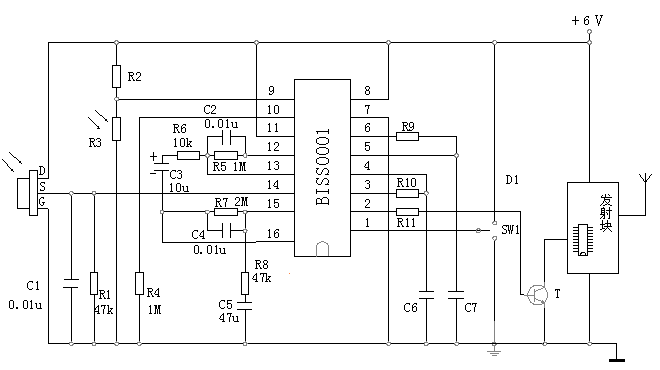 BISS0001的热释电红外无线感应器应用电路图
