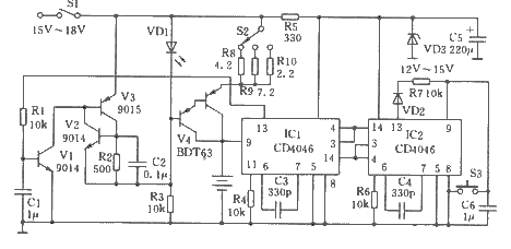电路中,VD3为IC提供恒定电压,可防止干扰。VDl、V4组成恒流电路,可防止误动作且转动开关S2,可获得不同的充电电流,按图6?15所示,可分别获得约50mA(R9挡)、300mA(R8挡)、1A(R10挡)的充电电流。电容Cl、电阻Rl为延时电路,它主要用以防止干扰引起误动作及可长时间不取出电池。若C6放电过多,电路便重新启动充电。S1为电源开关兼启动开关。S3为微动开关,可消除C6上电压对下次充电的影响。