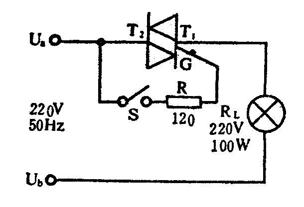 电路如图1所示。将220V交流电源的任意一端接T2,另一端经过220V、100W白炽灯接T1。触发电路由开关S和门极限流电阻R组成。S选用耐压220VAC的小型钮子开关或拉线开关。R的阻值取100~330Ω,R值取得过大,会减小导通角。