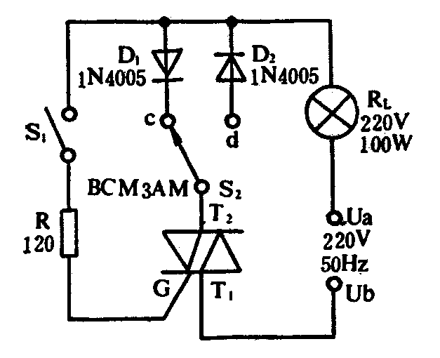 第一步:断开S1,将S2拨置c时,灯泡应熄灭。若灯泡发光,但亮度明显降低(100W灯泡亮度仅相当于25W灯泡),说明双向晶闸管沿T2→T1的方向击穿短路。此时D1对220V交流电作半波整流,灯泡上的电流平均值减小,亮度降低。