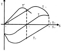 正常运转的伺服电动机,只要失去控制电压,电机立即停止运转。当伺服电动机失去控制电压后,它处于单相运行状态,由于转子电阻大,定子中两个相反方向旋转的旋转磁场与转子作用所产生的两个转矩特性(T1-S1、T2-S2曲线)以及合成转矩特性(T-S曲线)如图4所示,与普通的单相异步电动机的转矩特性(图中T′-S曲线)不同。这时的合成转矩T是制动转矩,从而使电动机迅速停止运转。
