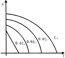 图5是伺服电动机单相运行时的机械特性曲线。负载一定时,控制电压Uc愈高,转速也愈高,在控制电压一定时,负载增加,转速下降。