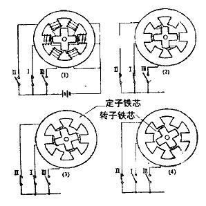 状态(1) ,开关I闭合,A相通电。由于A相绕组受到激磁,空气隙里出现如箭头所示的磁场。A相上的两个定子磁极和两个转子齿对准,转子处于平衡状态。若再闭合开关R激励B相,如状态(2)所示, B相的定子磁极以同样的方式产生磁场。在磁力线的张力作用下,产生逆时针方向的转矩。于是,转子沿逆时针方向转过一个固定的角度,到达状态(3) 。图中,转过的角度为15°。如果现在打开开关I,去掉A相的激磁,转子将再转15°,到达状态(4) 。因此,转子的角位置可以用这种开关方式进行控制。若开关以某种时序转换,则转子就能以步进运动的方式连续旋转;若进一步使时序转换的速度可调,则平均速度也能用这种开关方式进行控制。