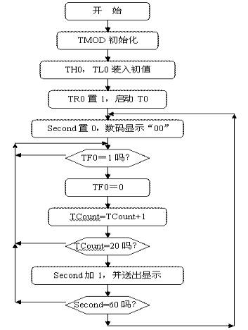 现在我们选择16位定时工作方式,对于T0来说,最大定时也只有65536us,即65.536ms,无法达到我们所需要的1秒的定时,因此,我们必须通过软件来处理这个问题,假设我们取T0的最大定时为50ms,即要定时1秒需要经过20次的50ms的定时。对于这20次我们就可以采用软件的方法来统计了。