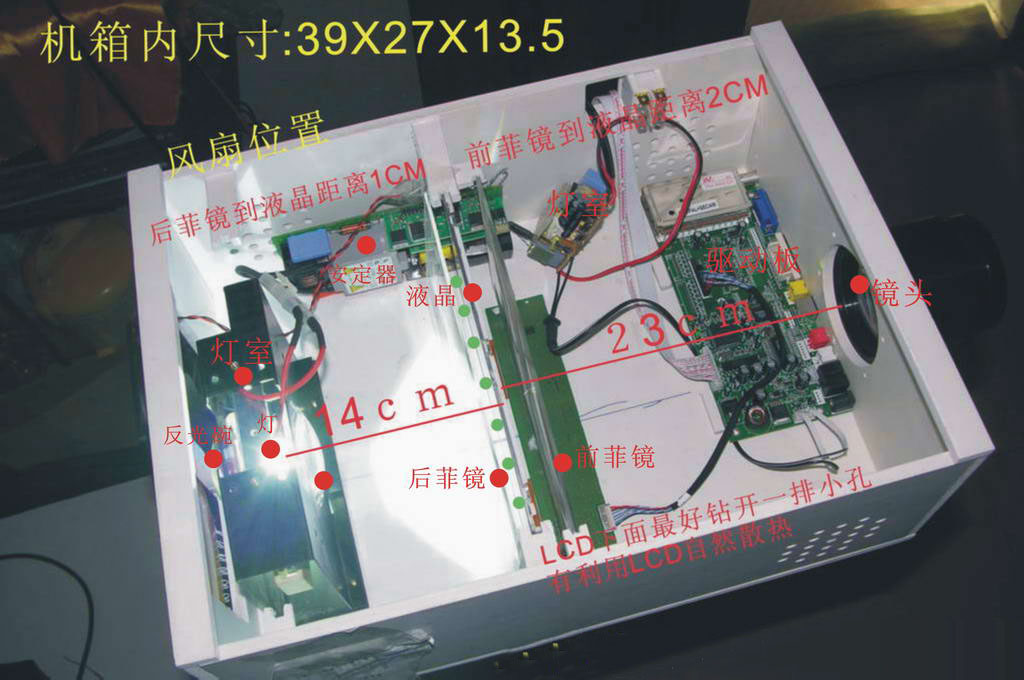 注:灯发光需要相应的电源(镇流器),液晶驱动工作需要12V电源,还要有一个风扇来排热气,投影还需要注意环境光线,白天没有晚上好.