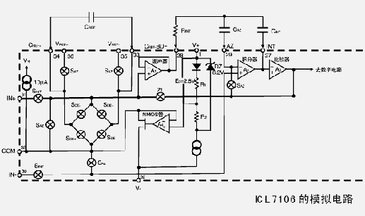 830B工作原理:该仪表的心脏是一片大规模集成电路,该芯片(7106)内部包含双积分A/D转换器,显示锁存器,七段译码器和显示驱动器,它的工作原理框图见示意图2。输入仪表的电压或电流信号经过一个开关选择器转换成一个0到199.9mV的直流电压。例如输入信号100VDC,就用1000:1的分压器获得100.0mVDC;输入信号100VAC,首先整流为100VDC,然后再分压成100.0mVDC。电流测量则通过选择不同阻值的分流电阻获得。