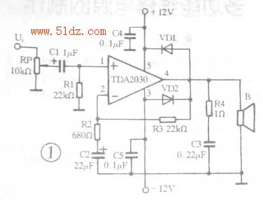| 选择分类:当前分类——音响功放 相关联或者相类似的文章: 简易音频集成功率放大器(1423) ++ 30W功率放大器的制作 +(933) C语言在单片机开发中的应用 (741) 巧用STK3048A制作前置放大(718) 音响发烧“土炮”的自画像(搞笑)(494) 18W D类单片音频放大器TDA7481(326) 自制2.1声道多媒体音响系统(262) 100W纯直流高保真功放(196) Hi-Fi配音控制放大器制作(176) 双50W数字功放TDA8902J(146) LM386功放集成电路的应用(127) 国外汽车音响的新技术(44) TDA2030A装的18W单声道功放板(-8) 图示均衡器的使用技巧(-14) Hi-Fi功放设计要点(-34) 用TDA7294推动的功放(-72) LM1875带音调双22W功放板(-120) 首页 前页 后页 尾页 本站推荐: | 简易音频集成功率放大器 本文介绍的音频功率放大器是用集成功放TDA2030为主的电路,其制作简单,价格低廉,输出功率大,保真性好,适合初学者和大、中专学生。 一、电路工作原理 ![]() 图1所示电路为音频功率放大器原理图,其中TDA2030是高保真集成功率放大器芯片,输出功率大于10W,频率响应为10~1400Hz,输出电流峰值最大可达3.5A。其内部电路包含输入级、中间级和输出级,且有短路保护和过热保护,可确保电路工作安全可靠。TDA2030使用方便、外围所需元器少,一般不需要调试即可成功。 RP是音量调节电位器,C1是输入耦合电容,R1是TDA2030同相输入端偏置电阻。 R2、R3决定了该电路交流负反馈的强弱及闭环增益。该电路闭环增益为(R2+R3)/R2=(0.68+22)/0.68=33.3倍,C2起隔直流作用,以使电路直流为100%负反馈。静态工作点稳定性好。 C4、C5为电源高频旁路电容,防止电路产生自激振荡。R4、C3称为茹贝网路,用以在电路接有感性负载扬声器时,保证高频稳定性。VD1、VD2是保护二极管,防止输出电压峰值损坏集成块TDA2030。 二、元器件的选择 集成功率放大器TDA2030。 RP为碳膜电位器。 C1、C2为电解电容器,耐压为16V,C3、C4、C5为瓷介电容。 R1、R2、R3为碳膜电阻,额定功率为1/8W。R4为碳膜电阻,额定功率为1/4W。VD1、VD2为IN4007小功率整流二极管。B为4Ω或8Ω、15W全频扬声器。 三、电路制作 ![]() 图2是本电路印制电路板图及TDA2030管脚图。 由于TDA2030输出功率较大,因此需加散热器。而TDA2030的负电源引脚(3脚)与散热器相连,所以在装散热器时,要注意散热器不能与其他元器件相接触。 [color=#006400]本站有相关元件提供给大家实践。[/color] 1、 本站不保证以上观点正确,就算是本站原创作品,本站也不保证内容正确。 2、如果您拥有本文版权,并且不想在本站转载,请书面通知本站立即删除并且向您公开道歉! |