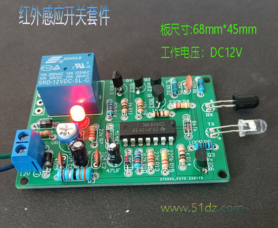 红外感应开关套件:工作电压12V,工作电流5~20mA,最大30mA,对应检测距离为0~50㎝。