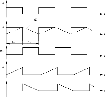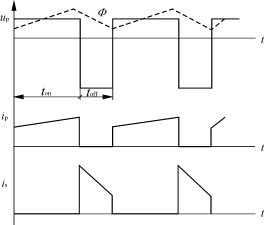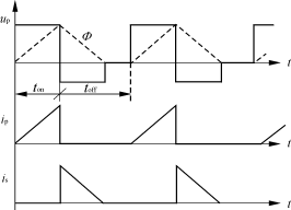 各参数波形如图4所示。从图4中可以看出磁通在toff期间不能复位,ip也不是从0开始线性增加,is下降不到0,这种工作状态输出电压Uo应满足如下关系: