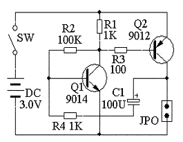 R1为Q1的集电极电阻,R2为Q1的基极的偏置电阻,使三极管Q1、Q2工作在放大状态。C1、R4组成反馈回路。当接通电源后,微小的电源波动或噪声经Q1、Q2放大,从Q2的集电极输出,再经C1、R4反馈回 Q1的基极,再经Q1、Q2进一步放大,再从Q2的集电极输出,经C1、R4再一次反馈回Q1的基极。。。就这样一次一次的放大,当放大到一定程度后,小灯炮点亮,当再放大到一定程度后,三极管完全导通不能再放大;由于不能再放大,微小的电源波动或噪声只能使输出端信号强度减少,经Q1、Q2后,从Q2的集电极输出更小的信号,再经C1、R4反馈回 Q1的基极,再从Q2的集电极输出进一步减小的信号,经C1、R4再一次反馈回Q1的基极。。。就这样一次一次的减小,当到一定程度后,小灯炮熄灭,当再小到一定程度后,三极管完全截止不能再减小;微小的电源波动或噪声又使输出端信号强。。。。就这样一直循环。小灯泡就亮、灭一直循环...改变C1和R4的值可以改变小灯泡闪烁的频率;C1变小可以加快灯自动变亮和自动熄灭的速度,反之亦然;R4变小可以缩短灯炮每次的点亮的时间,反之亦然。感快体验这种局外人体验不到的成功乐趣吧!