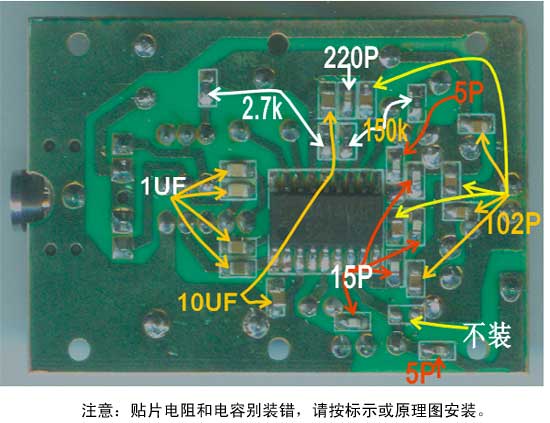 三、装配说明: 第一部分:焊粘片元件 安装之前请不要急于动手,应先查阅相关的技术资料以及本说明,然后对照原理图,了解印刷电路板、元件清单,并分清各元件,了解各元件的特点、作用、功能,同时核对元件数量。 准备好电烙铁、万用表、剪钳和镊子等必备工具,按照从低到高顺序,依次安装并焊接元件到电路板。 贴片元件的总体焊接方法是:先固定,后焊接。由于贴片元件没有固定孔,如果不先固定的话,焊接的时候容易导致元件移位,所以焊接前需要先将元件固定。 一、 贴片IC1404焊接 1、先用烙铁在元件一个引脚的焊盘上镀锡,用镊子夹住元件,摆正位置,然后固定元件。(一般是在四角的其中一个引脚上镀锡,然后固定。) 2、 一手拿着焊锡丝,另一只手拿着烙铁,分别固定剩余的4角的3个脚,焊接的时候注意焊接力度,千万不要让元件移位,四个角都固定后,再焊接的时候,元件就不会发生移位了。(如果担心自己摆不正元件,可以先用松香固定元件的四个角,方法是:用镊子夹住元件,放在焊盘上,确认焊盘对整齐后,用镊子夹住一小块松香,轻轻放到引脚上,用烙铁加热松香使其溶化,然后移开烙铁,让松香凝固,这样芯片就被固定住了,同样的方法固定好全部4个角,然后再次检查元件是否摆正,确认元件摆正后,用烙铁熔化焊锡重新固定元件的4个角。) 3、元件固定好后,一手拿焊锡,一手拿烙铁,烙铁尖放在元件的一角上,焊锡放在烙铁尖上,让焊锡融化,等焊锡融化成一个比较大的圆球后,向没有焊接焊锡的引脚方向慢慢移动烙铁(这时候可以使板子稍微向烙铁移动的方向倾斜一下,以便焊锡更好的流动),注意移动速度要慢,每移动到一个引脚处时要让焊锡在这个引脚处充分融化,这样才能确保该引脚不会被虚焊,移动的时候力度一定要轻,力度过大会损坏元件的引脚,这个过程需要多多练习才能够熟练操作,当烙铁拖过一边后,这一边的引脚就焊好了,通常一边焊接后,最后的几个引脚会被多余的焊锡连在一起,这时候可以甩掉烙铁头上多余的焊锡,将烙铁头在松香里面蘸一下,然后小心的用烙铁头在引脚之间划过,以去除多余焊锡,也可以将烙铁头放在连在一起的引脚处,拿起板子,待焊锡溶化后,用力把板子砸在桌子上,这样就能磕掉多余的焊锡,不过这样容易让锡渣流到板子的其他地方,注意把溅出的锡渣清理掉。 4、用同样的方法焊接所有的引脚。 二、 贴片电阻、电容等两脚贴片元件的焊接 1、贴片电阻、电容等两脚贴片元件焊接前,先用烙铁在电路板上电阻等两脚元件的一个焊盘上焊一点锡(在哪一个焊盘上焊锡依据个人焊接习惯,我比较喜欢先在右边焊盘镀锡,这样比较符合焊接习惯),也可以将板子上所有的两脚贴片元件的一个焊盘镀锡,这样比较省事; 2、在一个焊盘上镀完锡后,用镊子夹住电阻等两脚元件在对应的焊盘上摆正位置,用烙铁将元件的一端焊接到焊盘的镀锡一端,然后拿着焊锡丝将另一端焊住。一种比较省时省力的方法是:先将所有两脚元件的一端固定在相应位置的镀锡焊盘上,然后在同一焊接另一端引脚; 3、焊接时候要注意时间和力度,用力过大或者焊接时间过长会让对面的焊锡也融化了,这样容易导致元件移位。 焊接完所有引脚后,检查各个引脚之间是否有短路的情况,如果有,则用烙铁从两个引脚之间慢慢划过,这样让多余的焊锡吸附到烙铁上,从而消除短路。