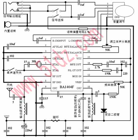 BA1404的引脚功能如图表1所示,图1为BA1404结构功能框图。它主要由前置音频放大器(AMP),立体声调制器(MPX),FM调制器及射频放大器组成。 立体声前置级分别为两个声道的音频放大器。输入为0.5mV时,增益高达37dB,频带宽度为19kHz。如输入信号中存在频率高于19kHz的成分,则必须在输入端加一个低通滤波器,否则两个声道的分离度会下降。 在立体声调制组,振荡器输出的38kHz信号于立体声调制。通常在16、17脚接一可调电阻,以获得最佳的通道分离度。 立体声混合信号(MPX输出信号)与导频输出信号(PILOT OUT)合成后的调制信号通过12脚进入射频振荡器并对载波进行FM调制,经射频放大后输出射频信号,射频信号的典型值在600mV左右。 BA1404内部还提供了一个参考电压单元VREF。设计者可以利用这个电压信号改变外接变容二极管的电容值,继而改变载波的振荡频率。因此,只要控制一个电阻的分压值就可以达到改变发射频率的目的,这是比较独特的设计。
