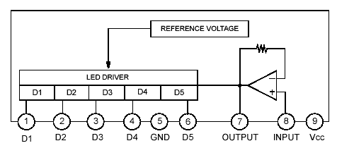 KA2284五段电平指示,KA2284B是五点发光二极管电平指示电路,其①比较器A、②比较器B、③比较器 C、④比较器D、⑤地、⑥比较器E、⑦放大输出、⑧输入、⑨电源 VCC。