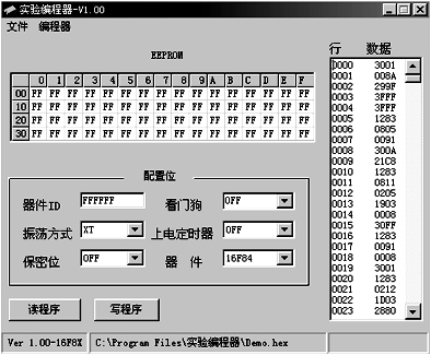 2PIC16F8X V101实验编程器的软件安装 该实验编程器的支持软件共有三张,都是标准软件格式。你只需在PC机视窗WINDOWS下运行即可进行安装。打开PC机,在PC机A驱中插入该编程器的第一张磁盘,用鼠标键点击显示器上“我的电脑”,再点击A磁盘(35英寸软盘),即可打开A:盘窗口,在此窗口上会出现9个文件,只点击其中的STEUPEXE文件即可在PC机上运行该磁盘软件,然后注意操作安装过程中的适当提示语句,PC机会自动地将三张磁盘的软件安装到你选定的硬盘中(笔者是把该软件放在PC机的D盘中)。待安装完毕,可用配套的电缆线RS232插头,一端插入PC机RS232串口(串口1、2、3、4任选)插座上,一端插编程器的RS232插座上。接着在编程器的供电电源口中插入电源适配器(15V~17V,该适配器电源不分极性)和DIP插座上安上PIC16F8X芯片,这时编程的准备工作全部完成,此时电源指示灯LED即亮。