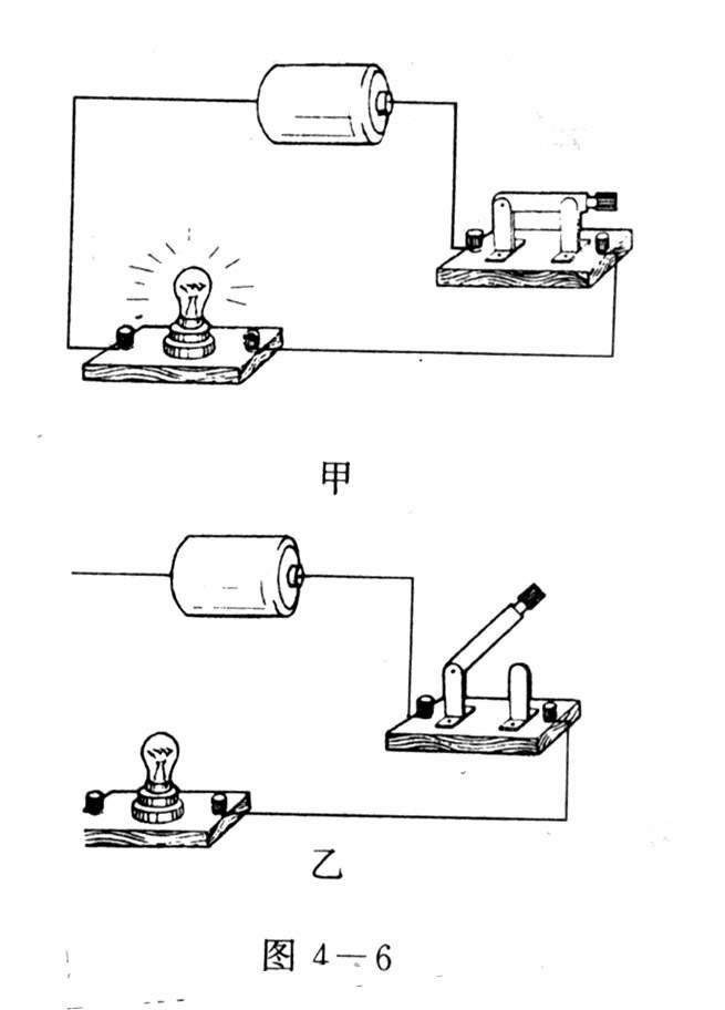 实验照图4-6那样,把小灯泡与干电池连接起来,合上开关,小灯泡就持续发光(图甲);打开开关,小灯泡就熄灭了(图乙)。