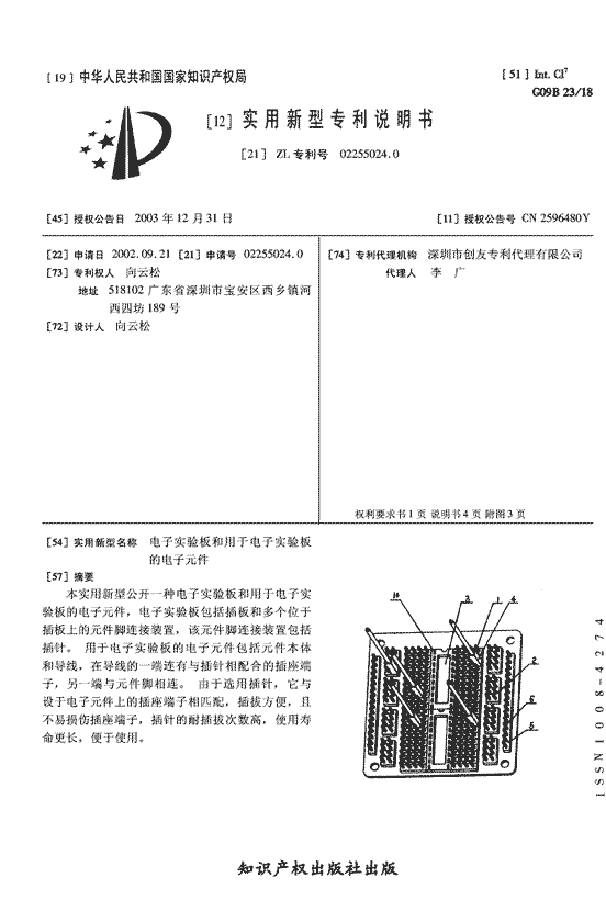 附录9:《电子实验套件》专利证书 (本站地址10年没变,2002年申请专利也是现在地址)