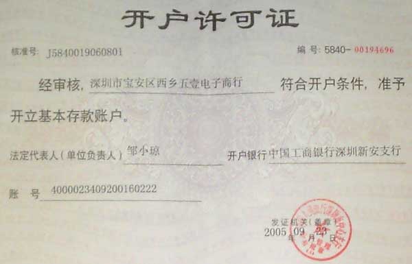 帐号名称是“深圳市宝安区西乡五壹电子商行”